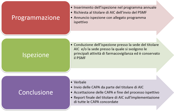 - Ispezioni richieste dal Committee for Medicinal Products for Human Use (CHMP) dell’EMA per medicinali autorizzati con procedura centralizzata. Queste ispezioni possono essere di routine o straordinarie (Triggered). L'organizzazione generale e il processo per le ispezioni di farmacovigilanza richieste dal CHMP sono descritte nella Union procedure on the coordination of EU pharmacovigilance inspections (EMA/INS/PhV/192234/2014) pubblicata sul sito web dell’EMA.